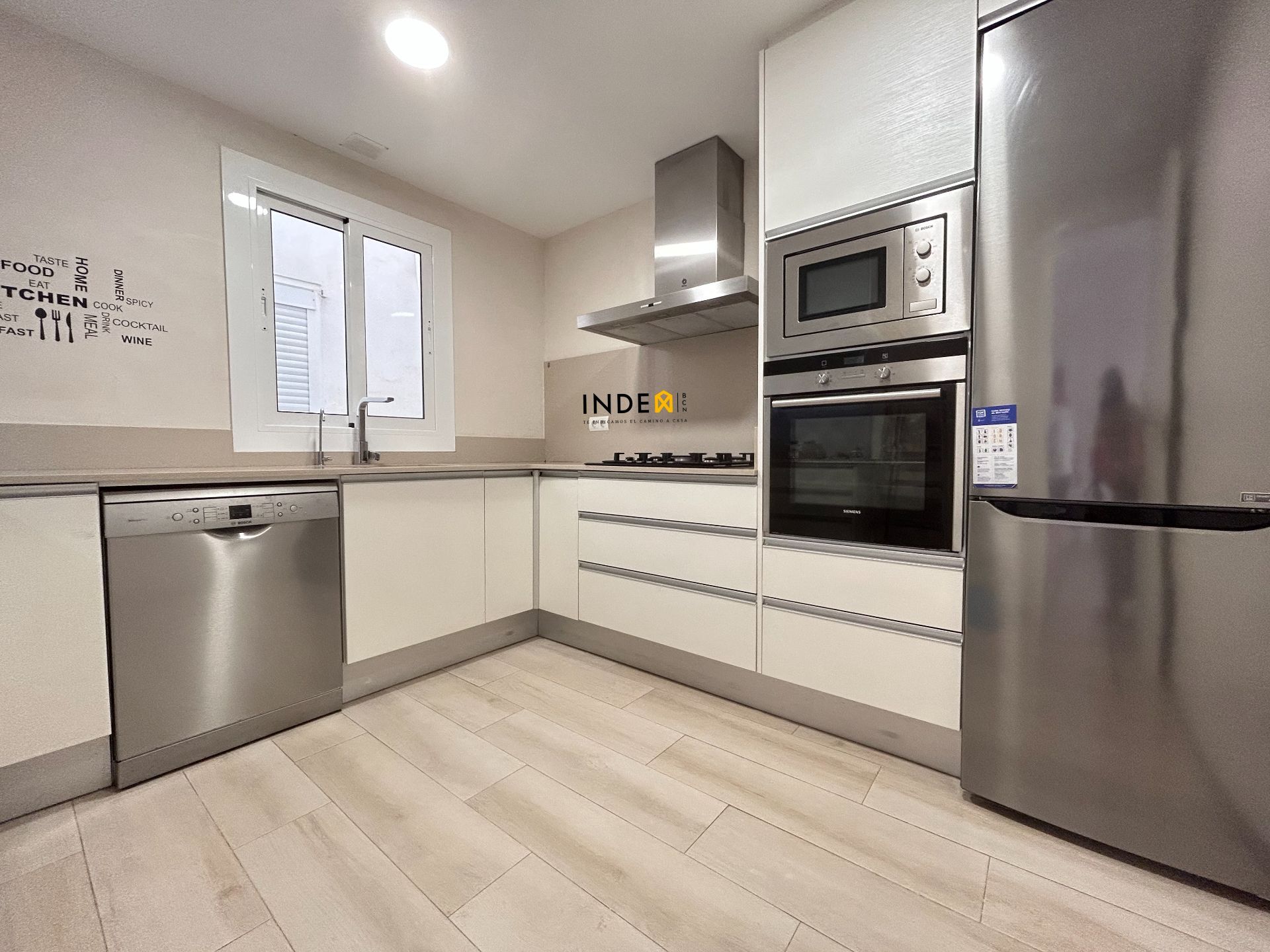 Cocina individual totalmente equipada, con horno, microondas, nevera y lavavajillas.